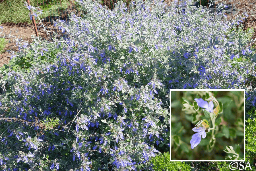 Bush Germander Teucrium fruticans 'Azureum' This evergreen shrub is a drought-tolerant plant native to southern Europe. It has small, fragrant leaves and small purple-blue flowers that bees love. It does best when grown in full sun and well-drained soils.