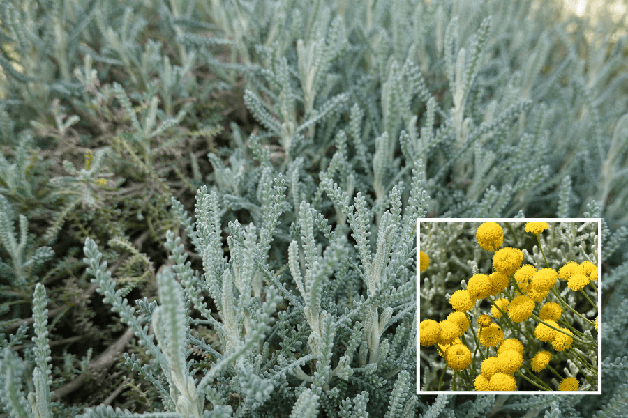 Andrea Casali2026-01-20T12:29:18-08:00Gray Lavender Cotton Santolina chamaecyparissus Gray Lavender Cotton, or Santolina chamaecyparissus, is a sun-loving and very drought-tolerant evergreen shrub native to the Mediterranean. It's silvery foliage releases fragrance when bruised and has button-like yellow flowers that attract many types of pollinators.