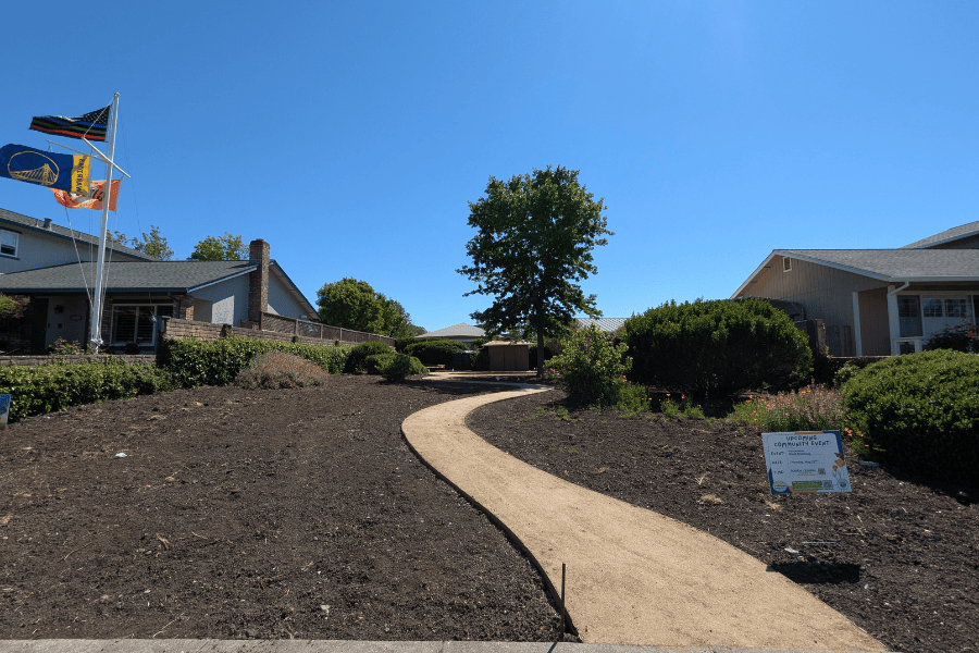 In Spring of 2025, ground was broken when a crew came out to remove some plants in order to make room for the new design that would reflect the community’s desires for the space. Shortly after that, Equinox Landscape installed ADA compliant pathways made of decomposed granite to allow accessibility to all.