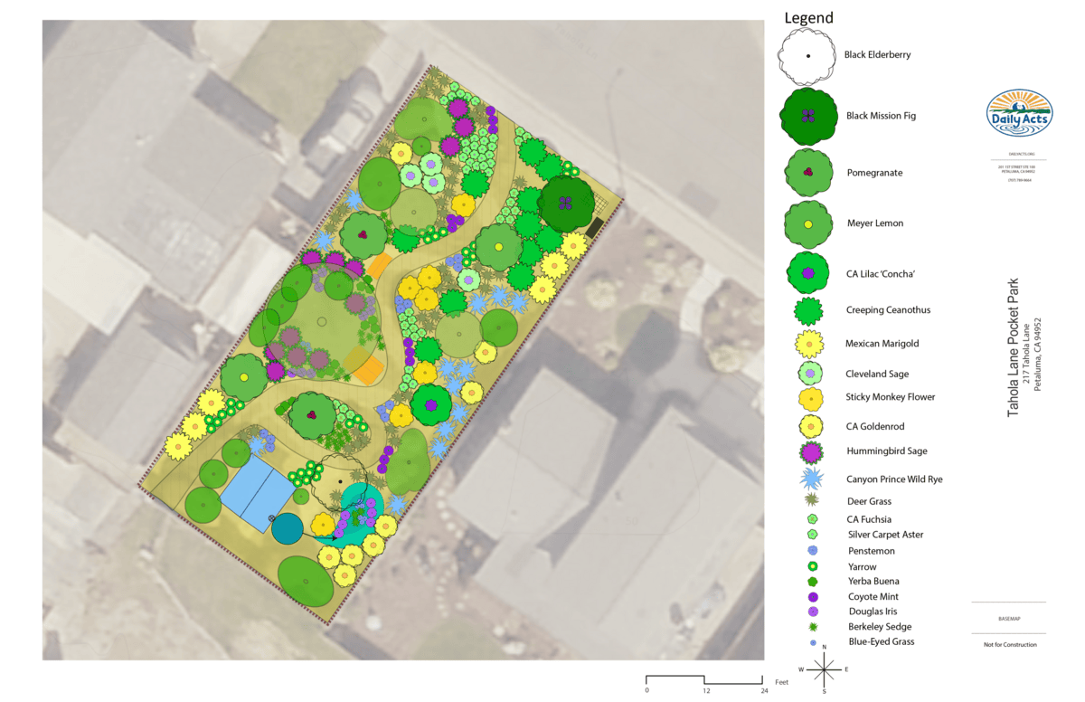 Over 40 volunteers from all over Sonoma County joined Daily Acts to help install 282 new native and drought-tolerant plants! Folks also helped add 5 fruit trees to the landscape that, once grown in, will invite neighbors to gather to harvest seasonal fruits. This second iteration of the landscape design aims to solve many problems at once— reducing water usage, improving biodiversity, increasing accessibility, and inviting people and pollinators alike to benefit.
