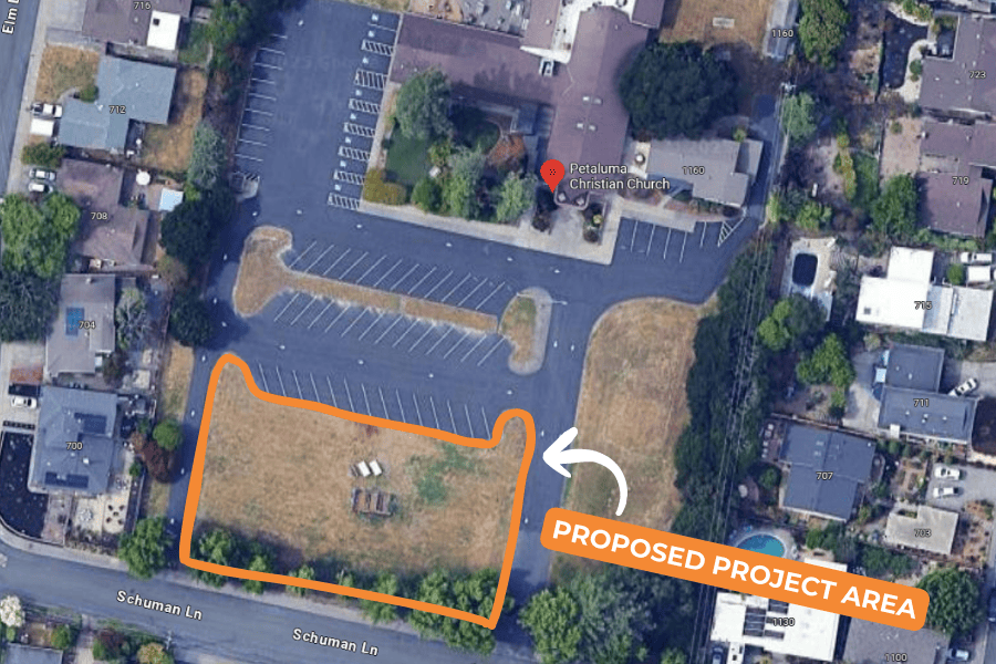 The project area for the Petaluma Christian Church is a 21,000 square foot section that includes a small existing community garden, which will be connected by a new “prayer path” that invites visitors to slow down, reflect, and enjoy the beauty of nature.