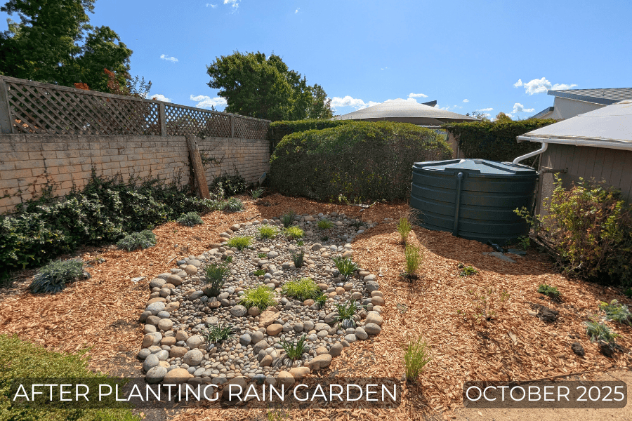Ten years later, it was time for an update. After talking with community members, we learned that the plants had become overgrown, making the space uninviting, and the river rock pathway made it difficult for people to walk on. Plans were made and enacted, over the span of a year: many plants were removed, river rock pathways were replaced with decomposed granite ADA compliant pathways, and sheet mulching was applied to the bare soil. The final culmination of this project happened October 11th, 2025: the Community Planting Day!